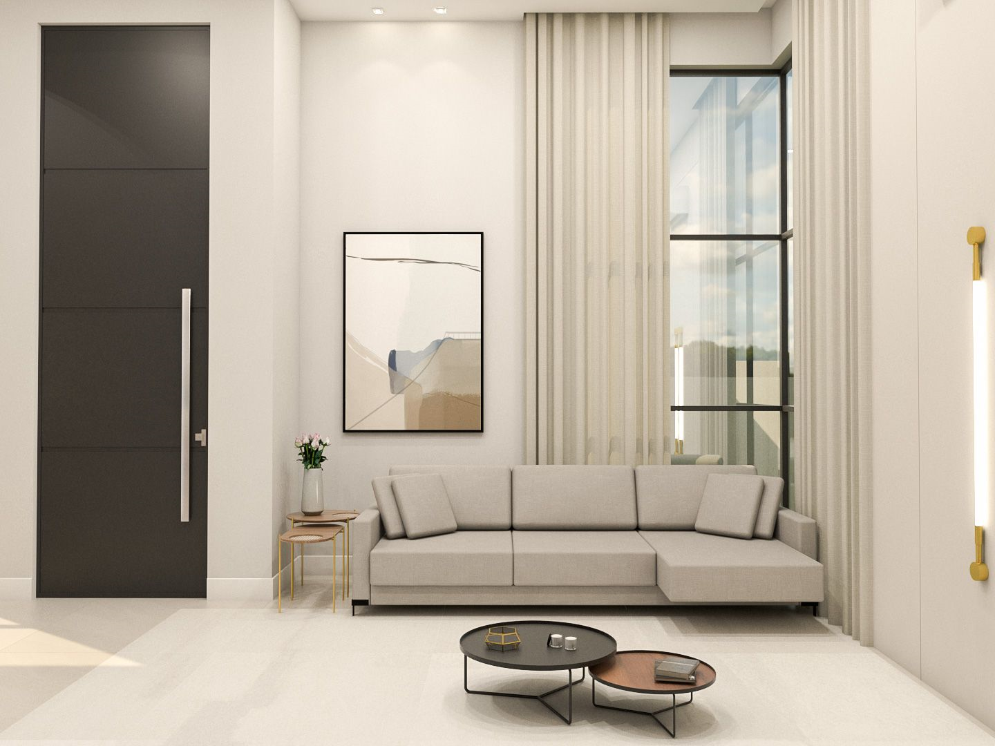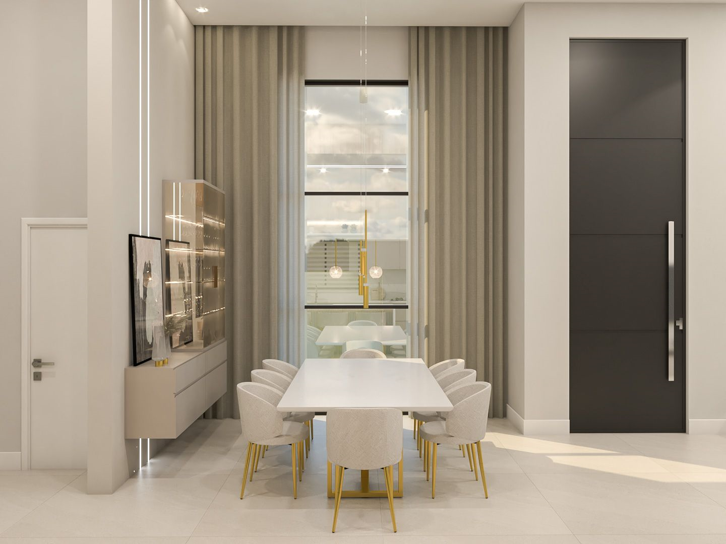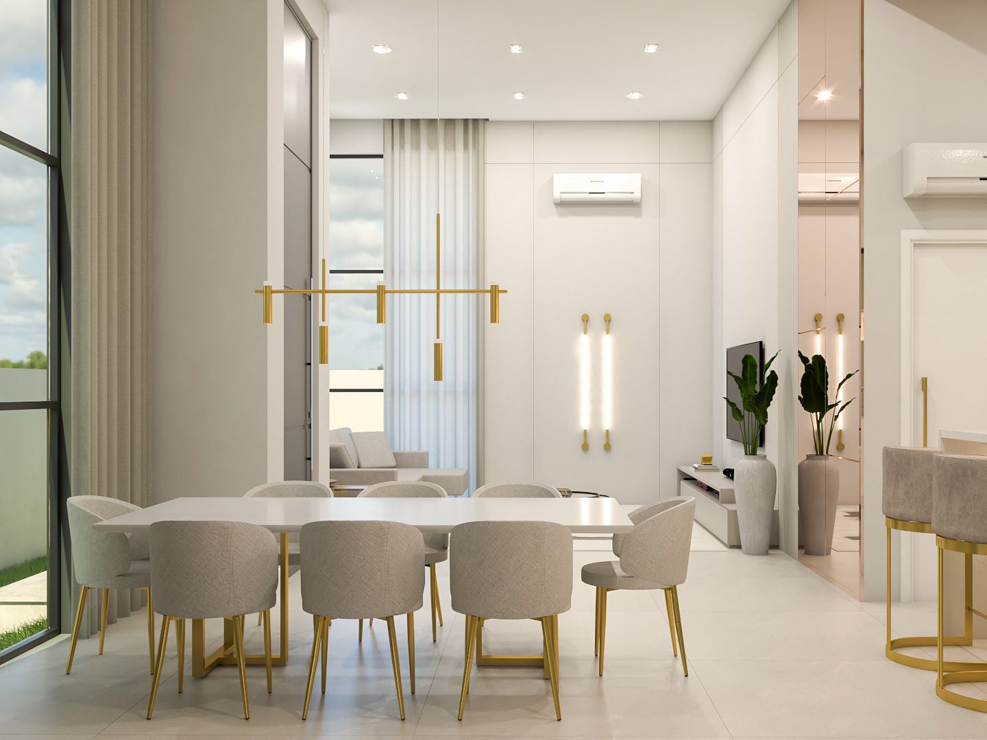 No projeto arquitetônico, também elaborado pelo escritório Kellen Carvalho, criamos uma área social com pé direito alto de 4,5 m, dando amplitude ao ambiente para assim desfrutarem de área diferenciada para receber bem amigos e familiares, integrada com porta de correr com a área gourmet da casa.