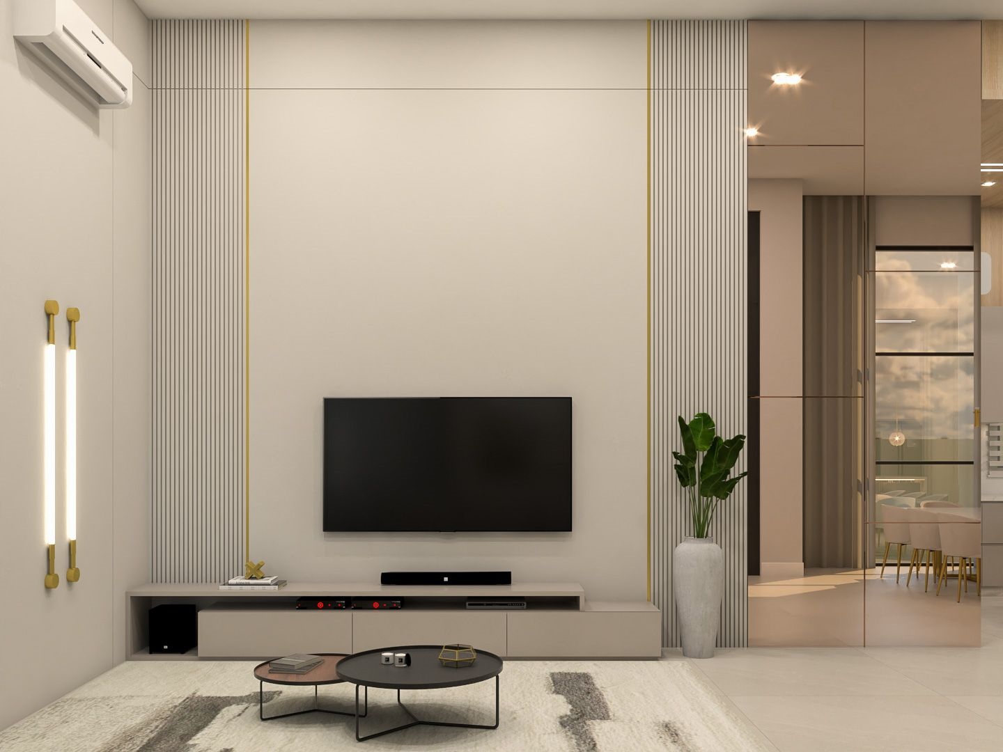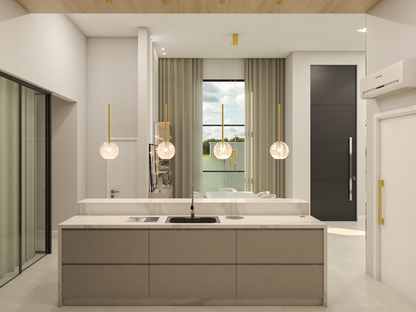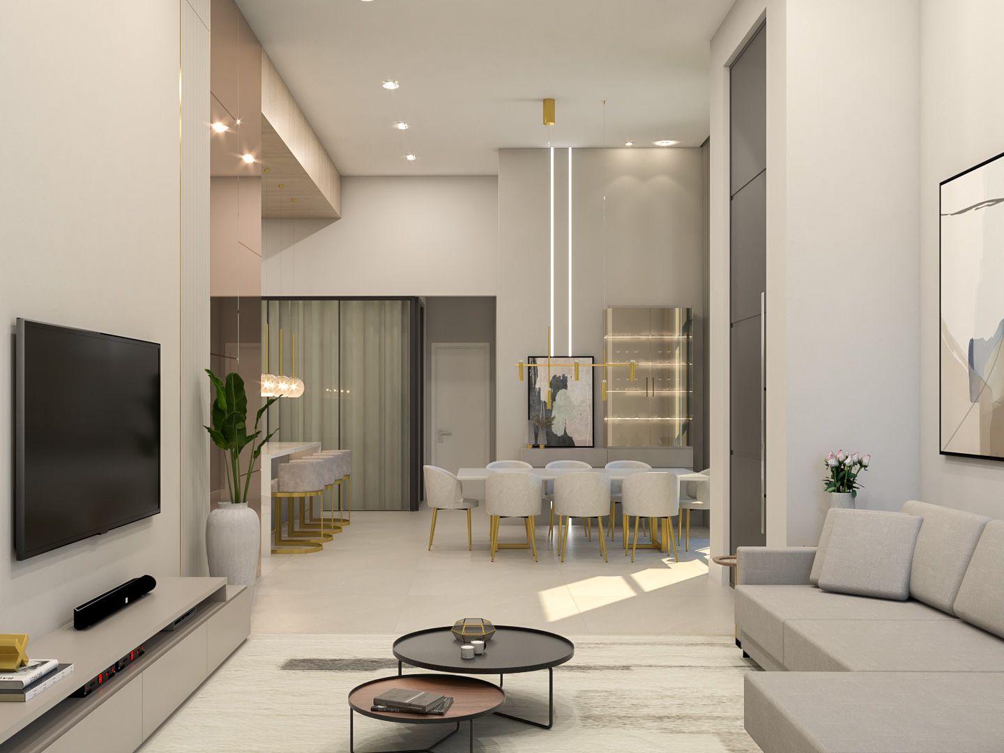 No projeto arquitetônico, também elaborado pelo escritório Kellen Carvalho, criamos uma área social com pé direito alto de 4,5 m, dando amplitude ao ambiente para assim desfrutarem de área diferenciada para receber bem amigos e familiares, integrada com porta de correr com a área gourmet da casa.