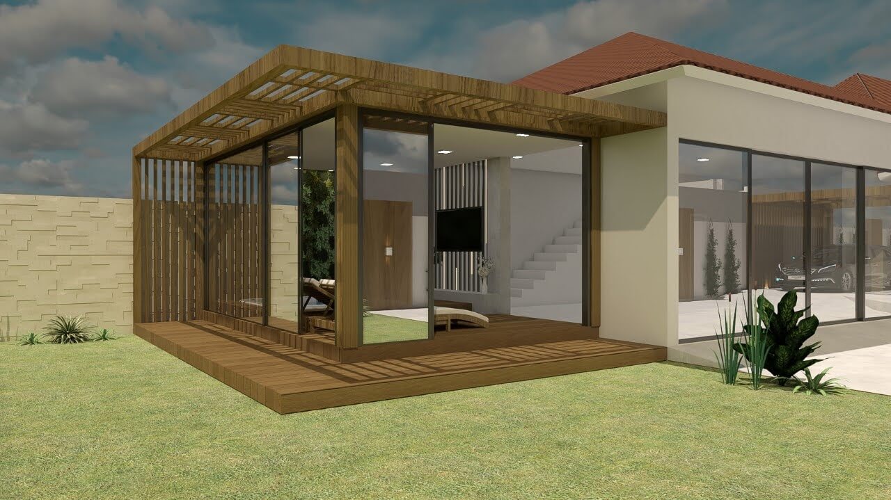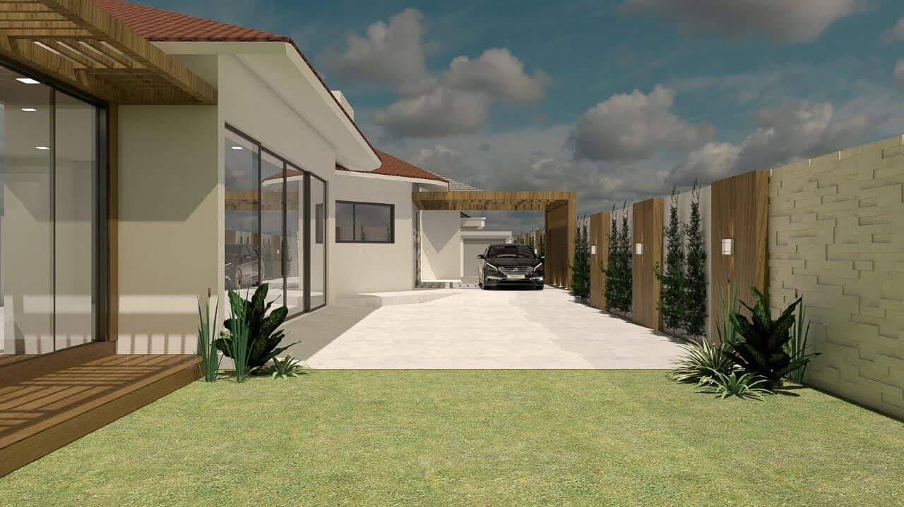 Valorizamos a entrada social da casa com um lindo pergolado que também tem como função acomodar e proteger o carro… Na ampliação para receber o spa, grandes aberturas em vidro, revestimento em porcelanato com efeito de madeira (fácil manutenção), pergolados e cobertura metálicas.