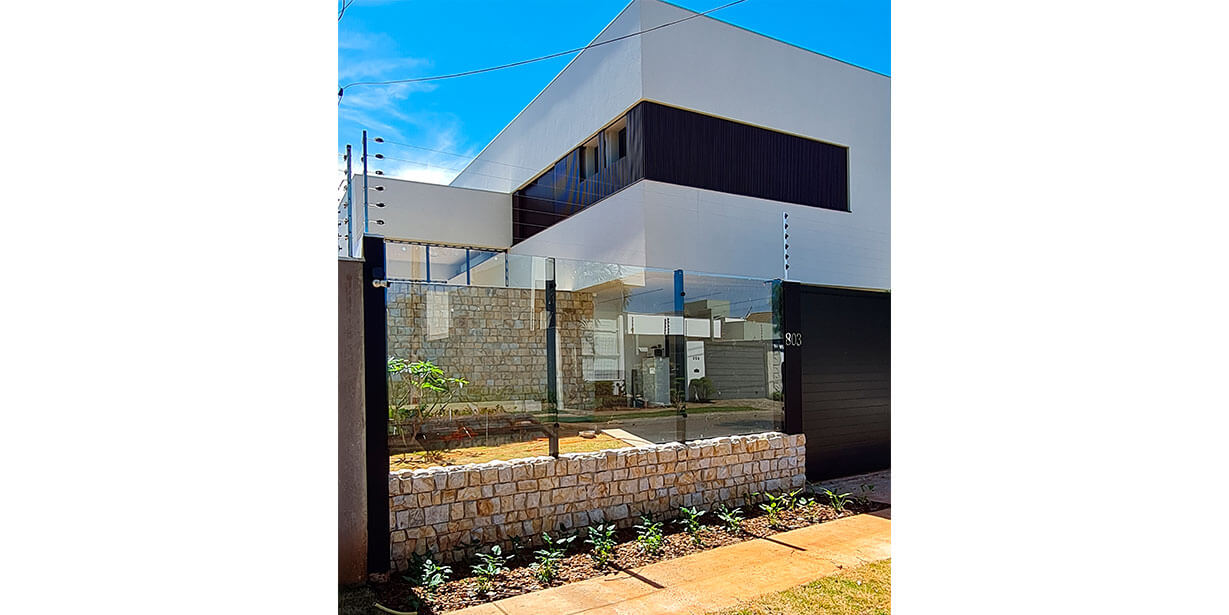 No piso superior estão quatro suítes, das quais, uma é master. Também um escritório e uma academia. As janelas do corredor, todo voltado pra piscina e face norte da casa, receberam um brise que proporciona conforto térmico para o pavimento superior da casa.