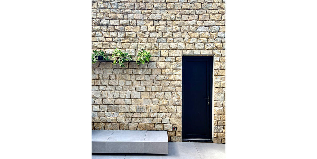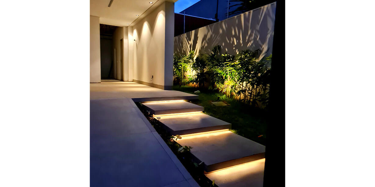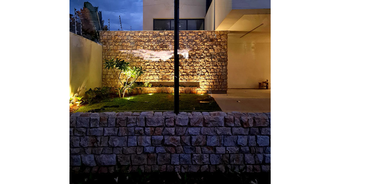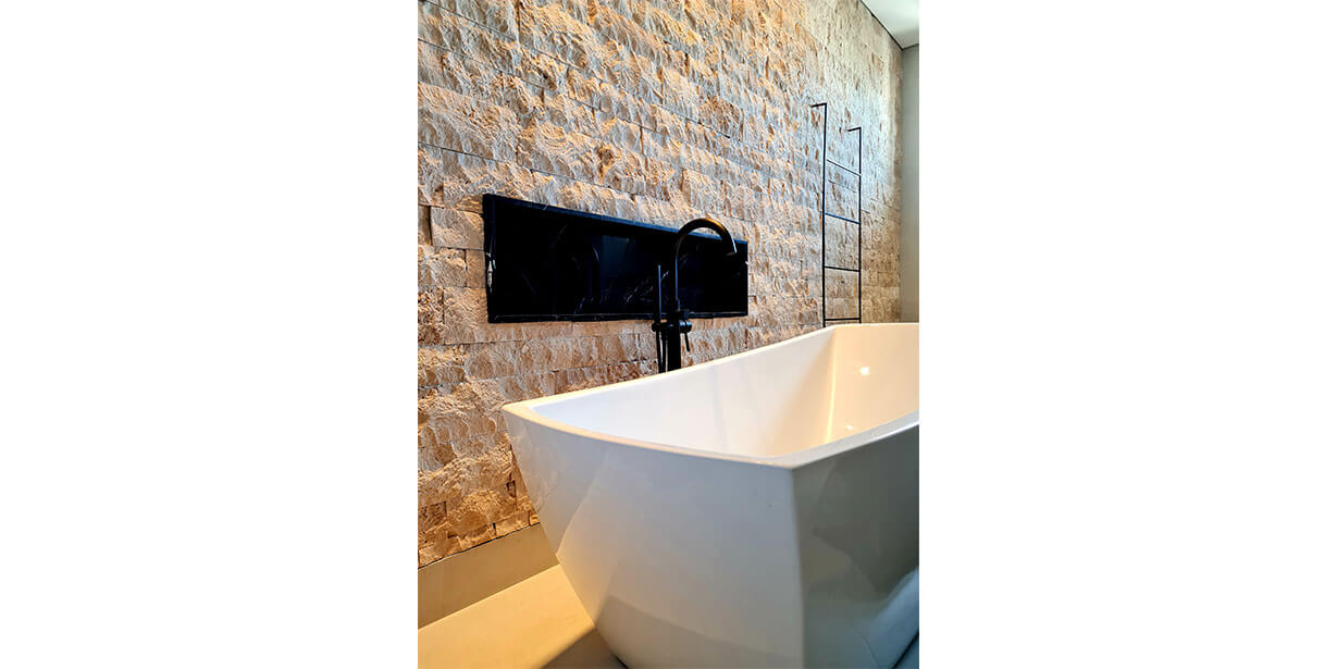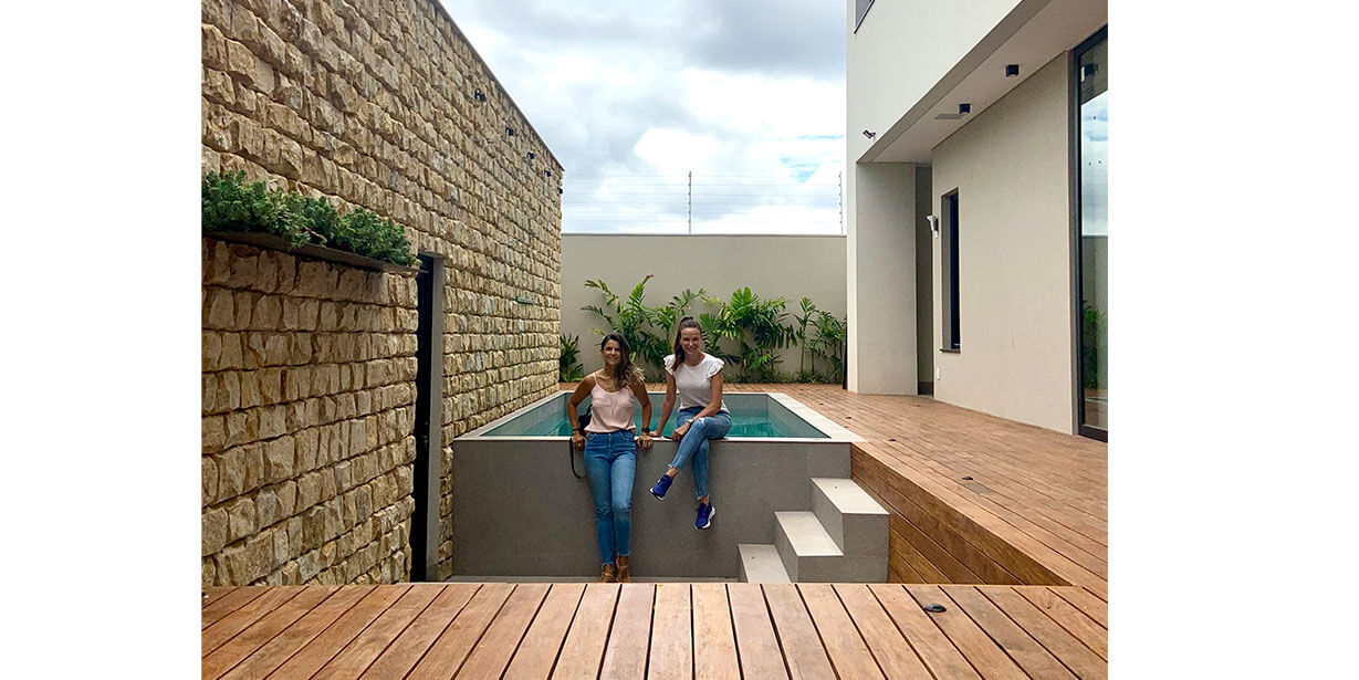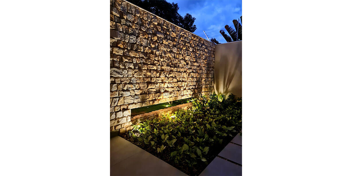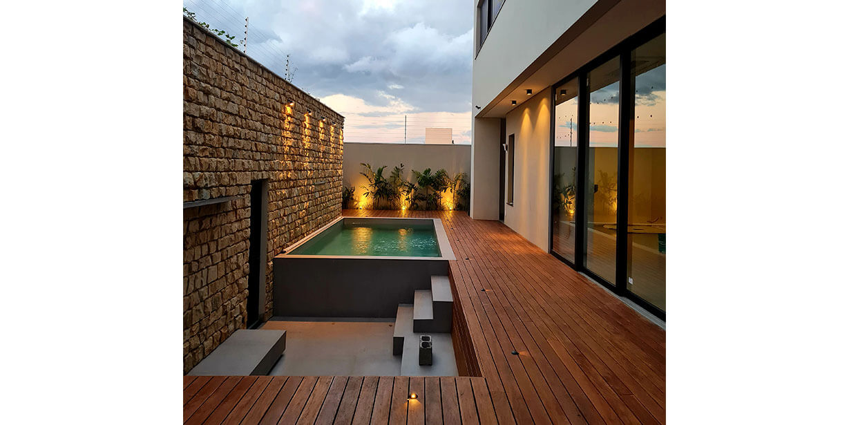 Saindo do gourmet criamos uma lareira ao lado da piscina. Esta lareira está totalmente enterrada, permitindo que o paredão de pedras ao fundo seja o protagonista do espaço. Este paredão fecha a lateral do bicicletário, casa de máquinas e sauna e segue ao longo de toda a lateral da piscina também.