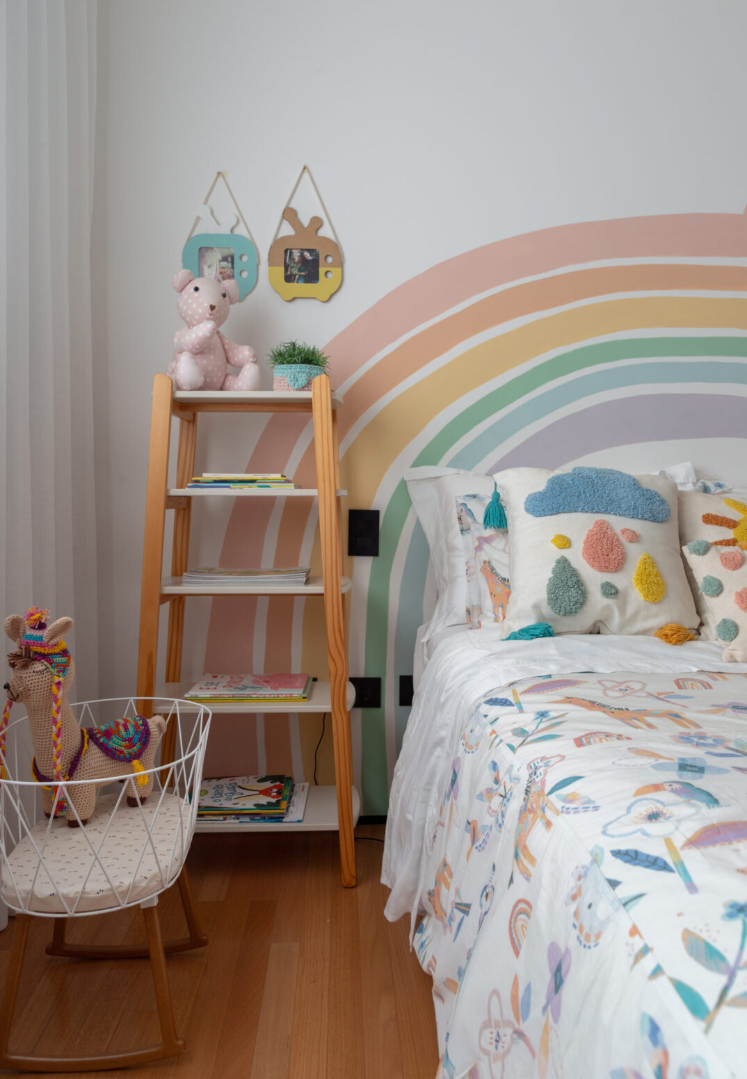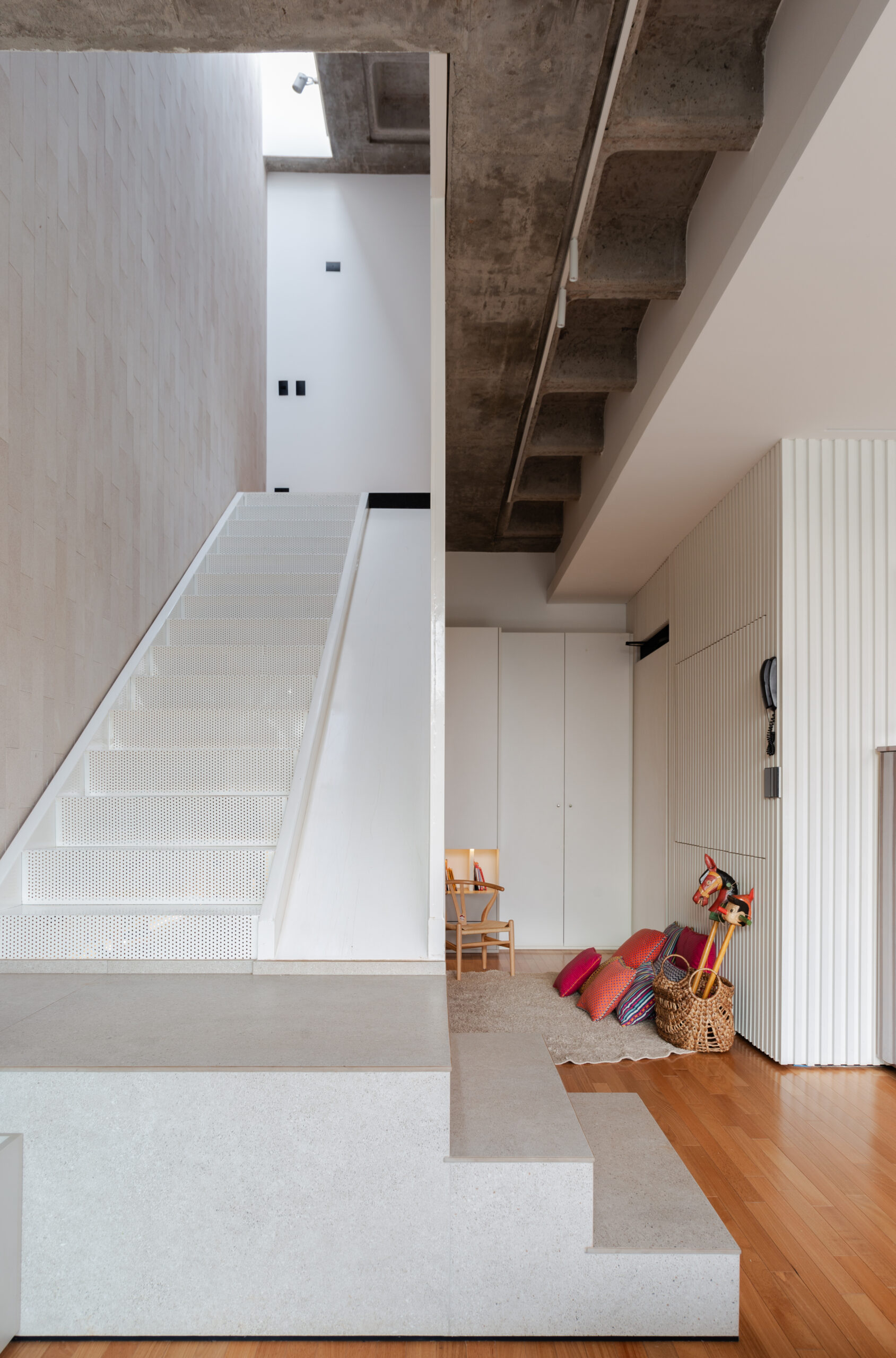 A escada dessa casa merece um destaque, pois além de acompanhar um escorregador logo ao lado, ela foi construída em chapa metálica perfurada. Ela cria um efeito bem interessante de luz e sombra, pois acima dela projetamos uma abertura zenital, então toda luz natural que vem de cima transpassa pelos furinhos da chapa e ilumina o ambiente logo abaixo, a brinquedoteca. Essa mesma chapa foi usada na lateral do escorregador, que além de proteger, cria o mesmo efeito de luz e sombra.