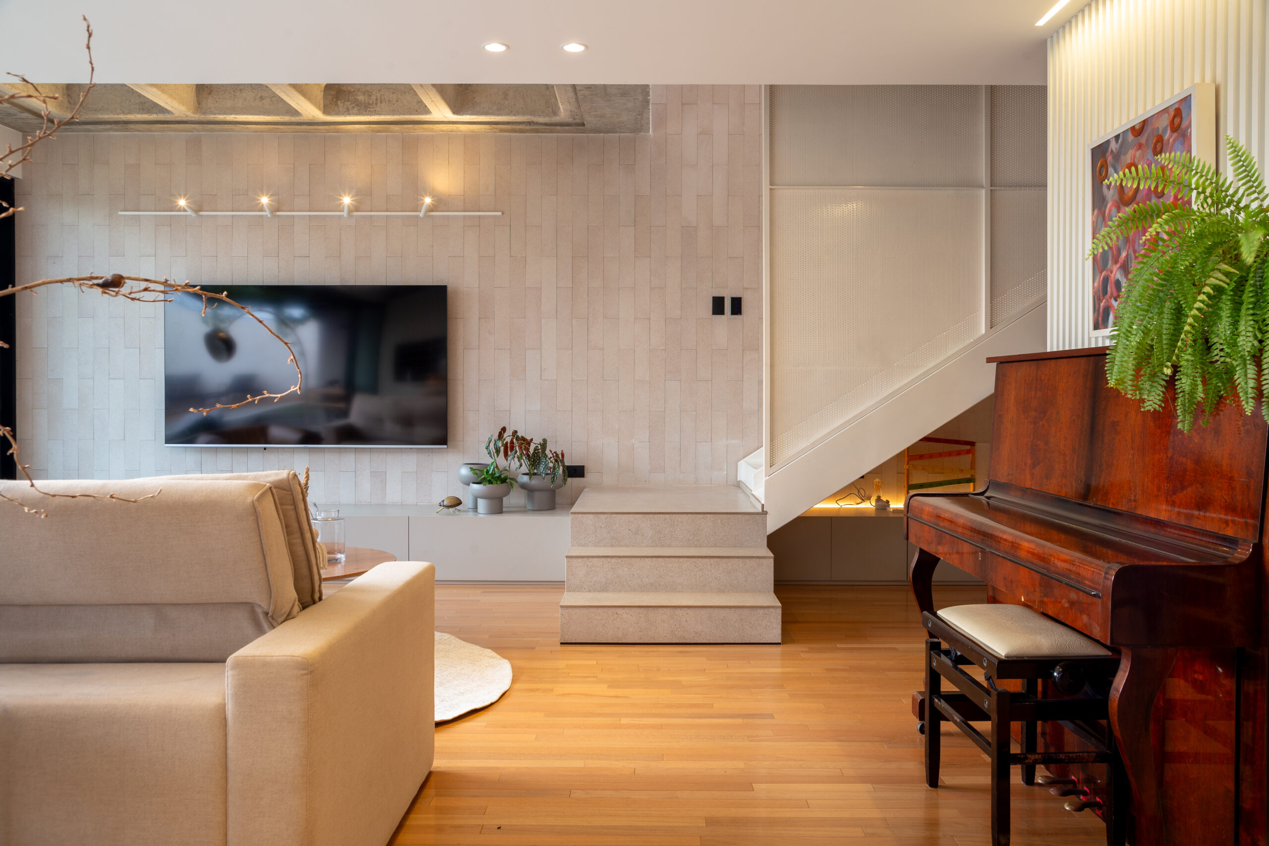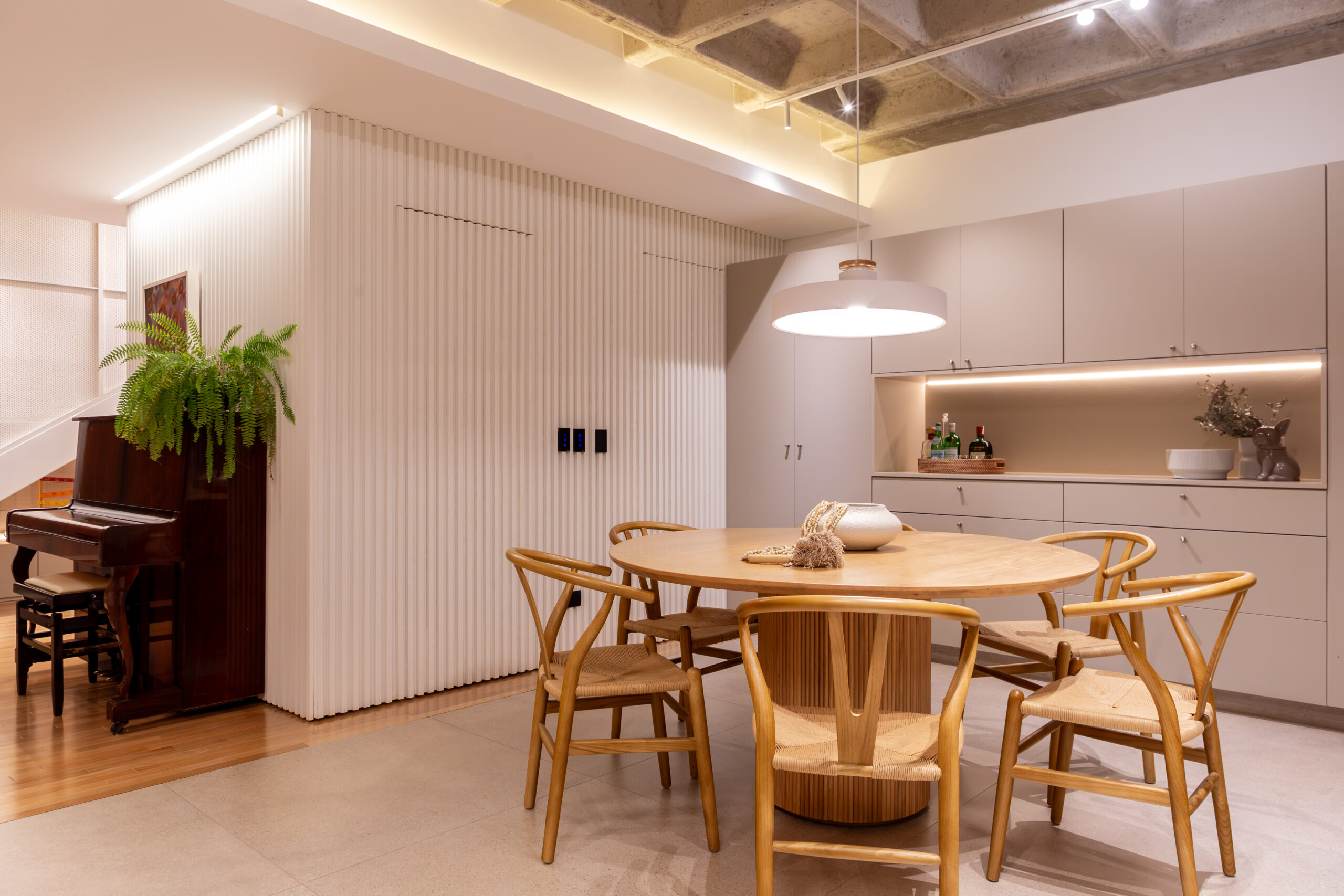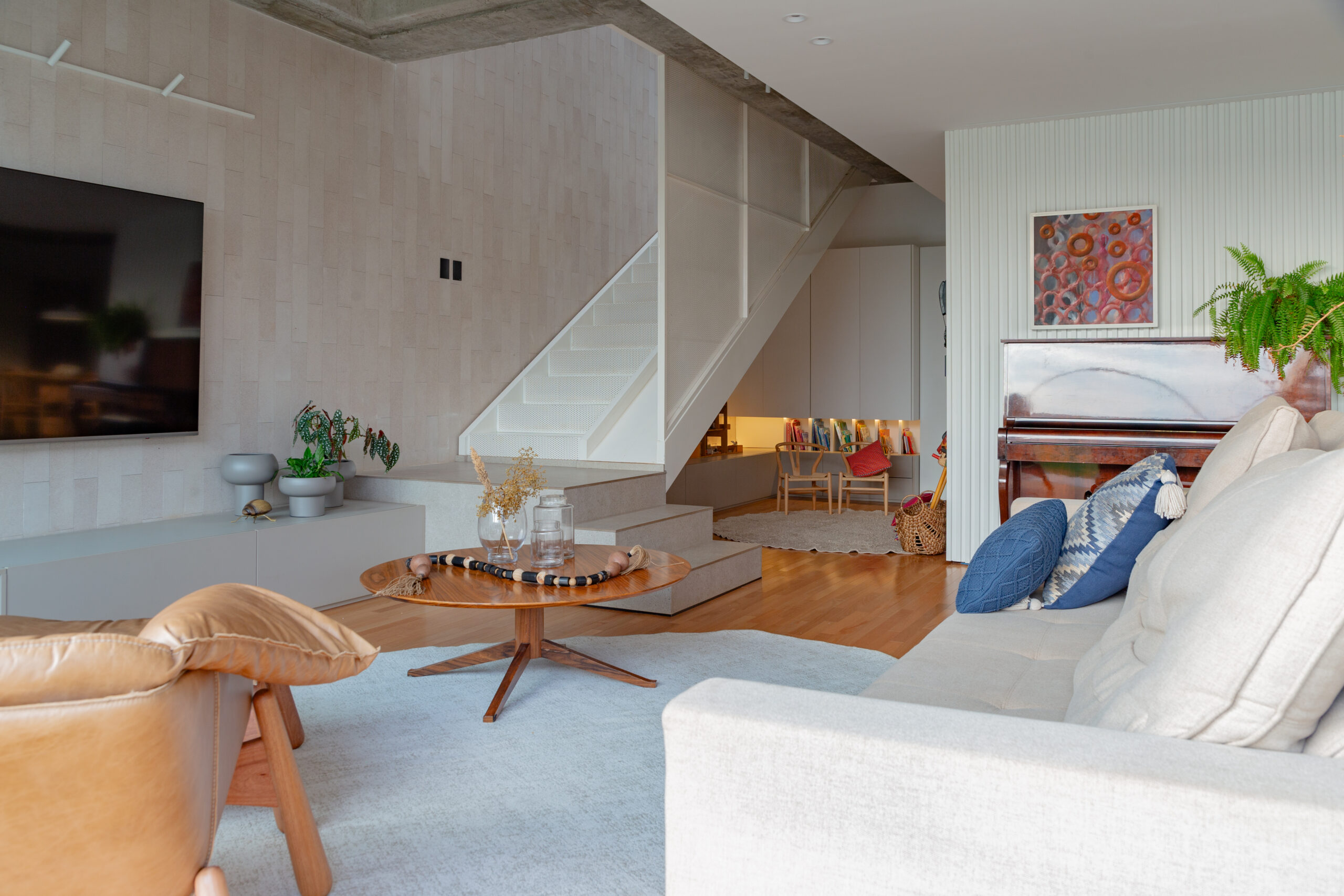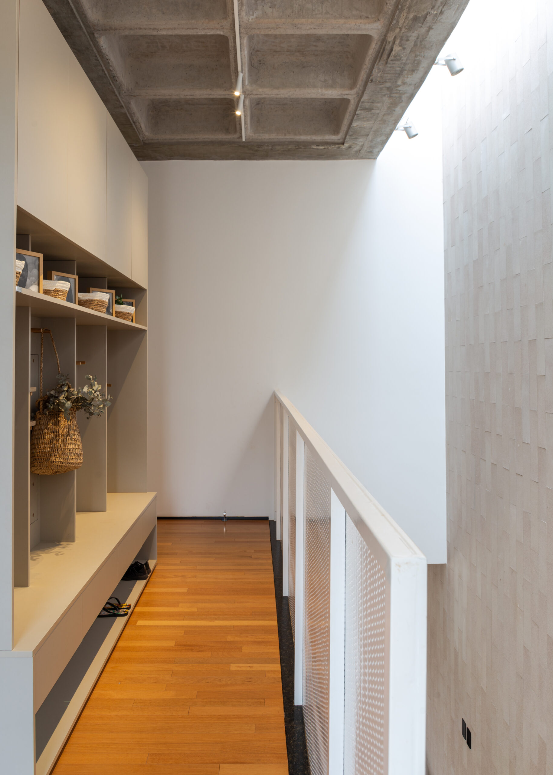 O pavimento superior abriga a garagem, um hall de entrada, um home office na circulação e 3 suítes. Já no pavimento inferior temos a brinquedoteca, sala, cozinha, jantar, tudo integrado. Esses ambientes são separados do quintal por portas de correr, em um vão de quase 10 metros, que permite quando tudo aberto, a integração do ambiente interno com o externo. Esse grande vão foi possível graças à viga protendida e à laje nervurada, que ficou aparente em boa parte da casa.