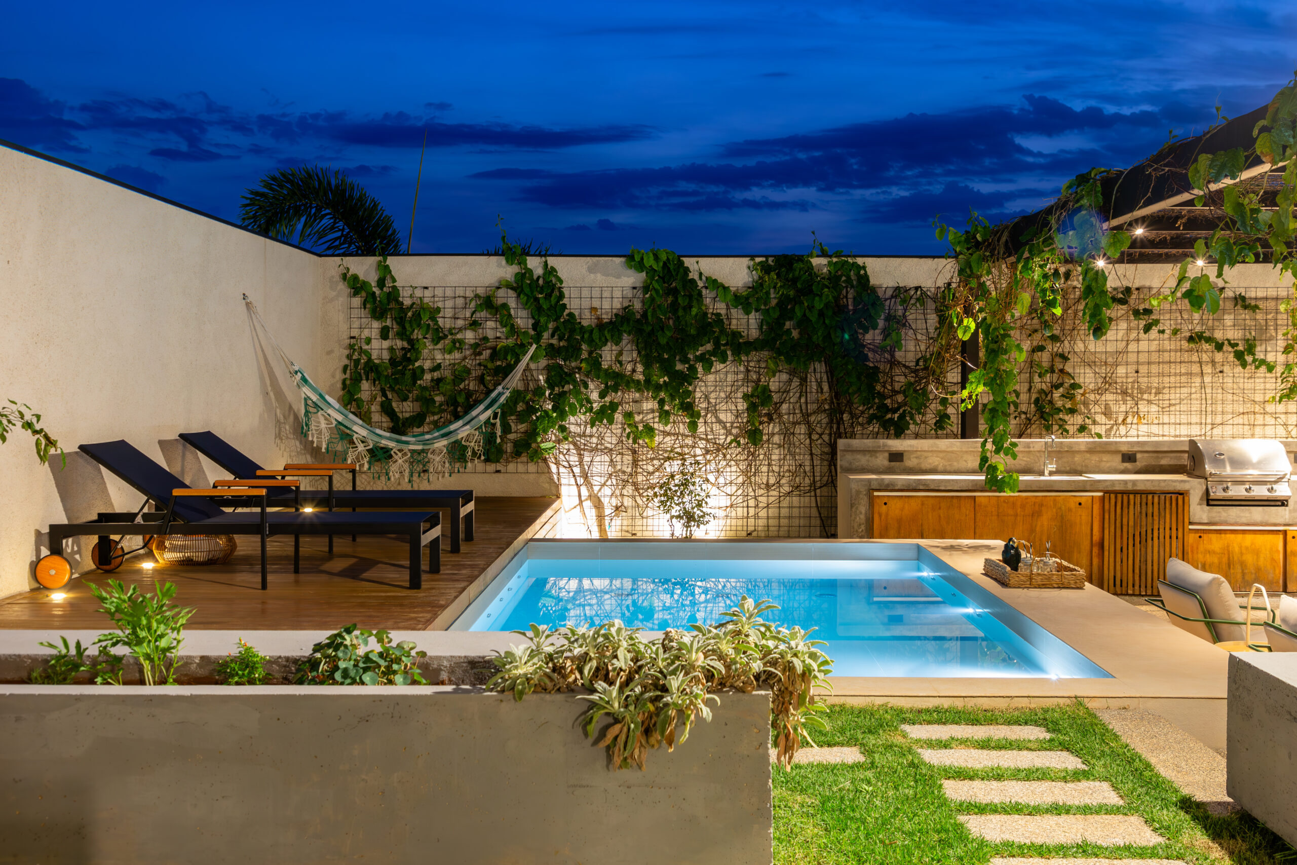 O quintal possui uma área gramada livre de 50 m². Ao lado foi criado uma área com piso drenante e uma bancada de concreto com uma pia, uma churrasqueira a gás e uma parrilla. Esse espaço foi abraçado com um pergolado metálico, com uma tela para servir de apoio para trepadeira, que trará sombra. A piscina fica logo ao lado do pergolado, e ela foi feita 45 cm elevada, assim criou-se um banco ao redor dela, o que ajuda na integração das pessoas da piscina com as pessoas do churrasco. O quintal ainda conta com floreiras elevadas, elas facilitam no manuseio da horta, além de limitar o crescimento das plantas e não avançar para o gramado.